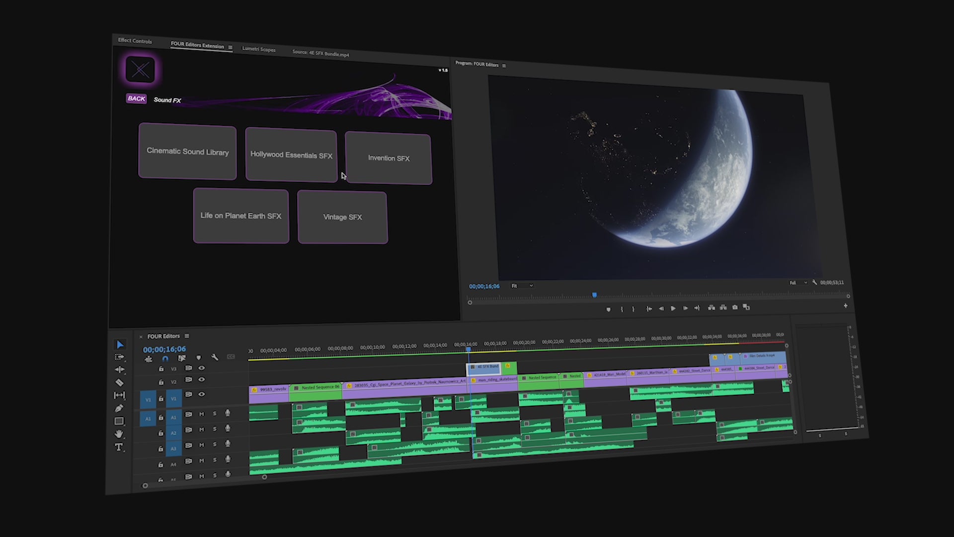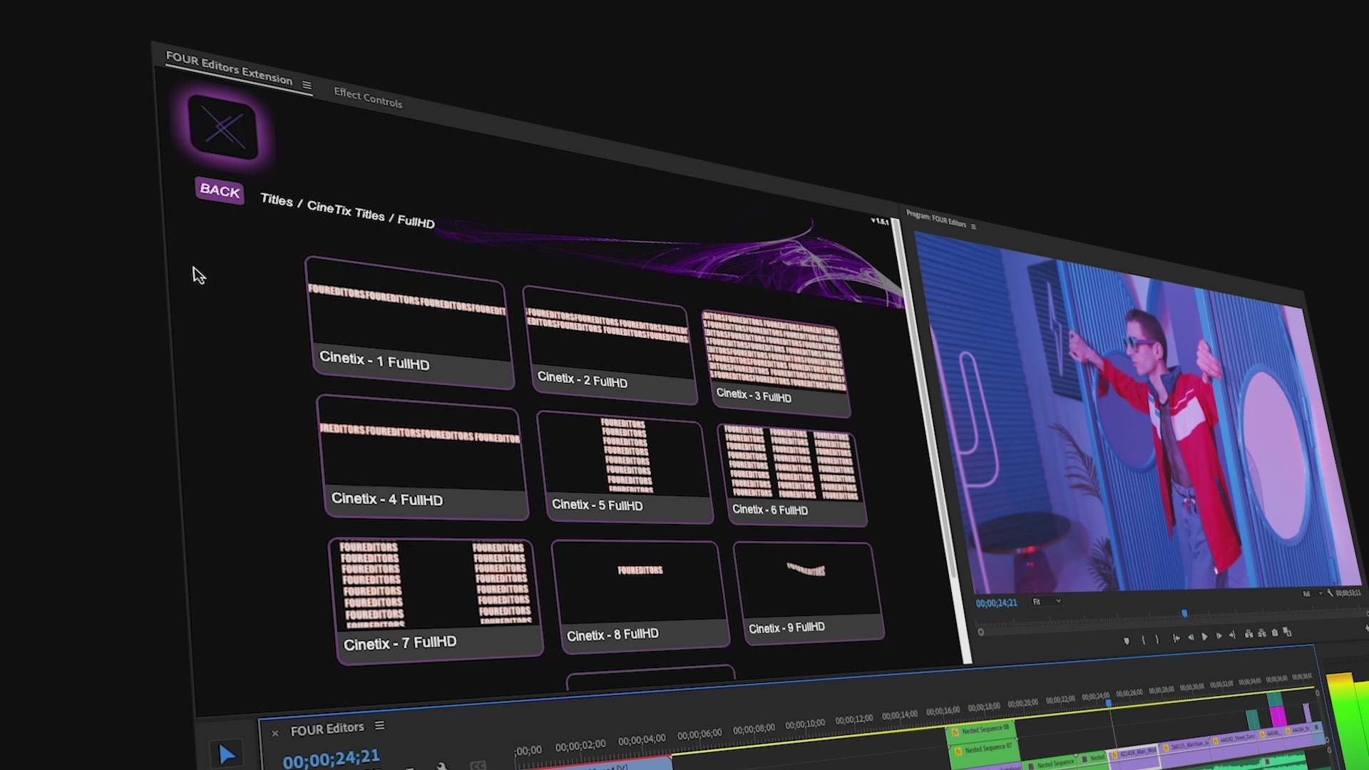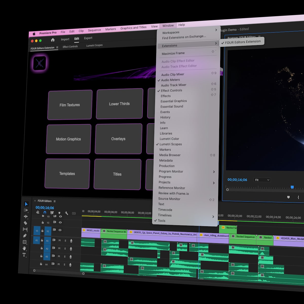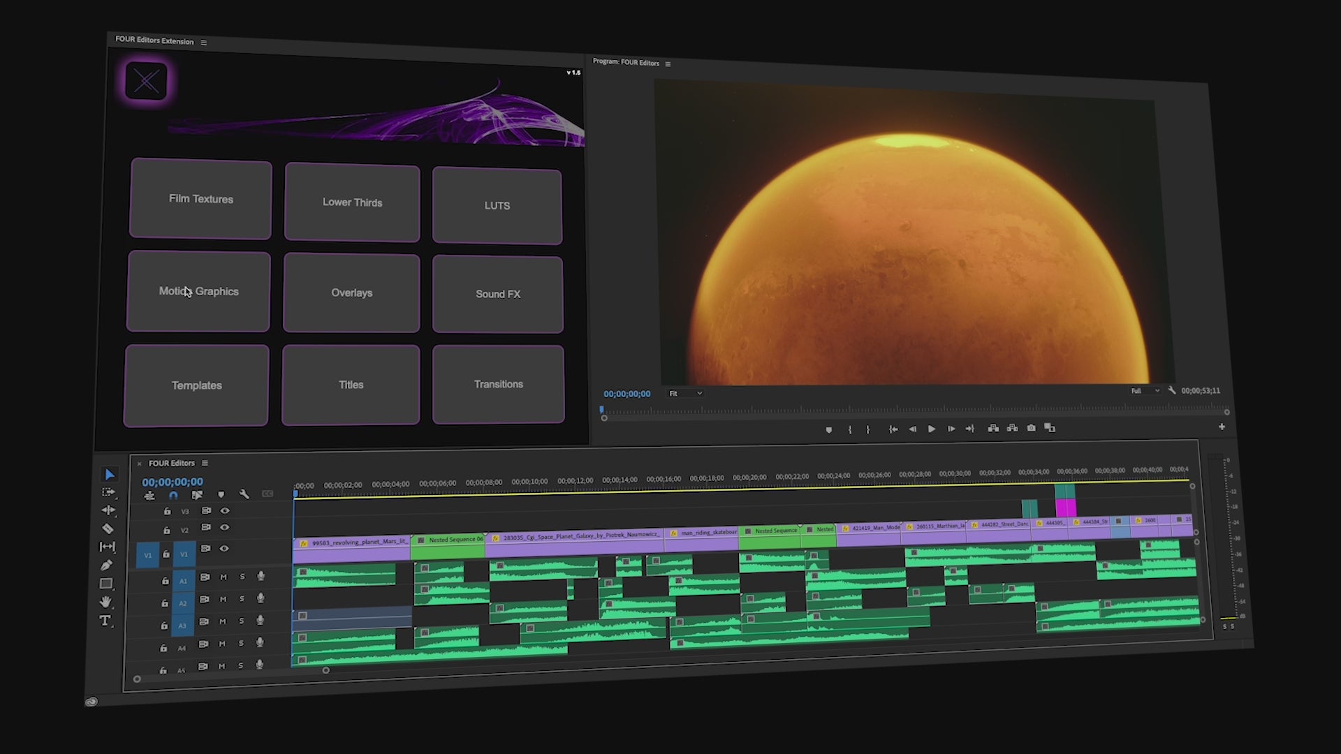 The FOUR Editors Plugin has everything you need to create professional-quality videos with ease. Easily drag and drop our premium-quality editing assets directly into your timeline.